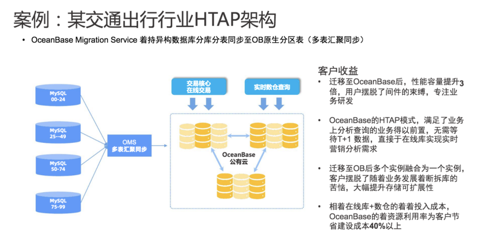 在某交通出行行业 HTAP 架构的案例中,迁移至 OceanBase 帮助性能容量提升 3 倍,帮助客户解决了随着业务发展着断拆库的苦恼,大幅提升存储可扩展性等痛点。