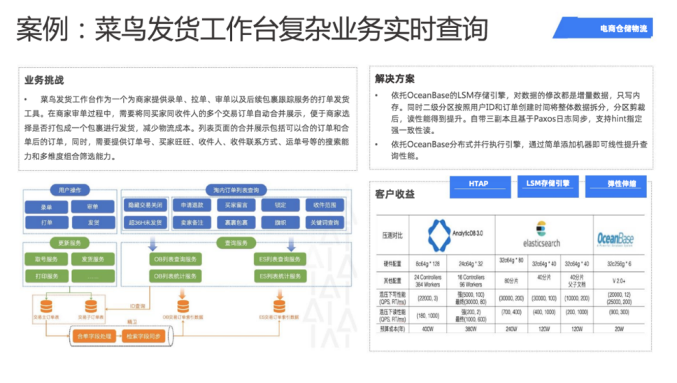 在菜鸟发货工作台的应用案例中,依托 OceanBase 的 HTAP 特性,助力客户提升海量存储下的写入和更新性能;同时依托 OceanBase 分布式并行执行引擎,通过简单的扩容操作即可近似线性提升复杂分析查询的性能。