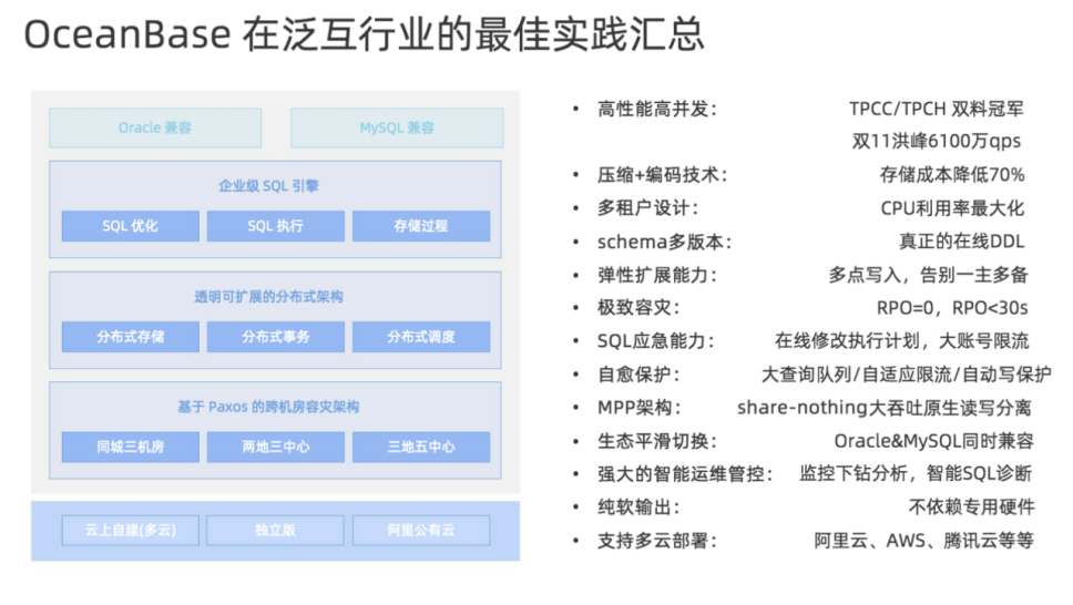 下图是 OceanBase 在泛互行业的最佳实践汇总。很多面向实际业务的优秀特性例如自适应限流、大查询队列、快速自愈等等,由于时间关系,不在今天一一展开,大家有兴趣欢迎在我们的官网社区展开讨论。