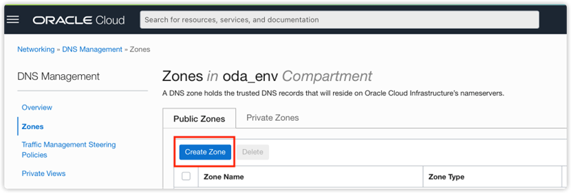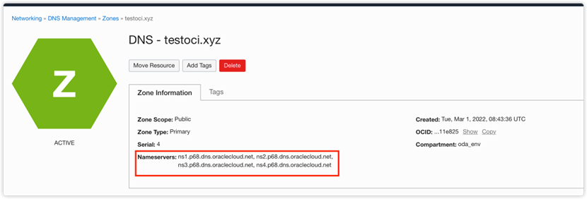 在OCI console 上,创建一个zone,代理解析testoci.xyz。