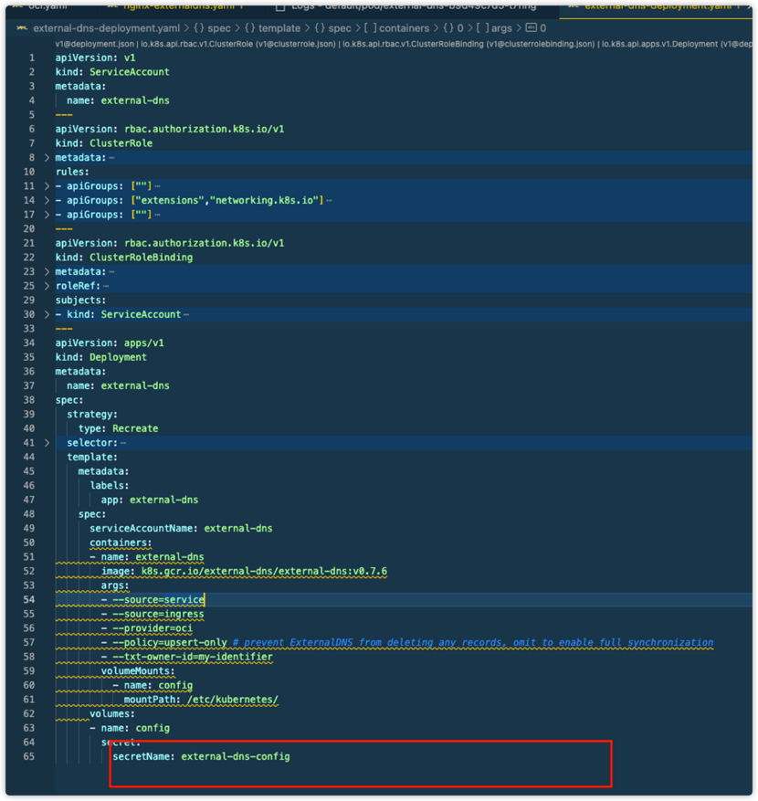 ServiceAccount/ClusterRole/ClusterRoleBinding等将上一步创建的Secret 名称external-dns-config填写到Deployment需要的secretName字段。