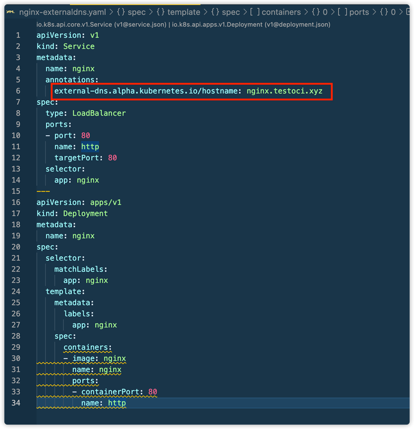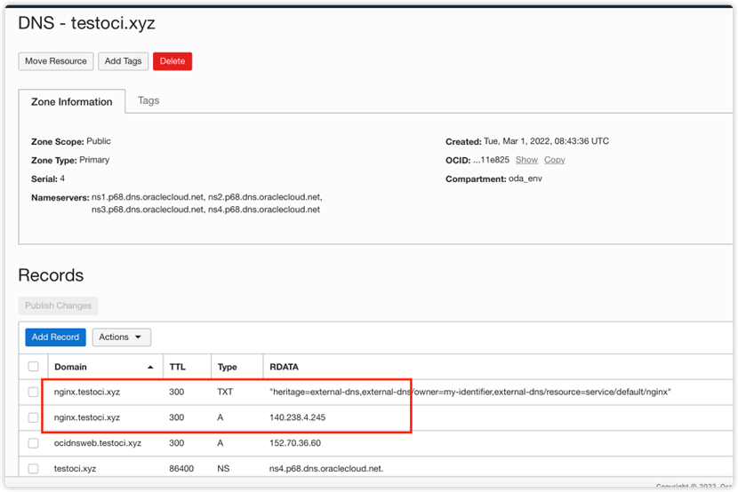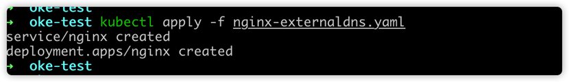 xternal-dns.alpha.kubernetes.io/hostnameannotation作为域名配置记录,测试程序配置为:nginx.testoci.xyz