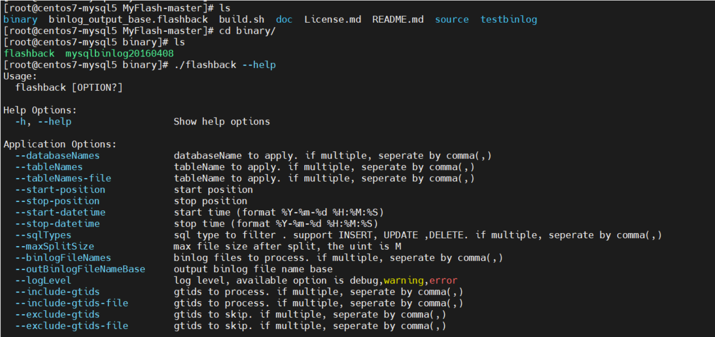 [root@centos7-mysql5 MyFlash-master]# yum install libgnomeui-devel./flashback --help有输出说明安装正确