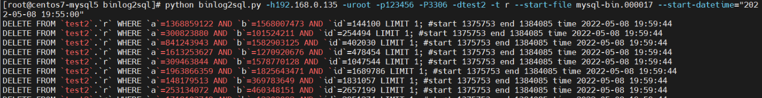 python binlog2sql.py -h192.168.0.135 -uroot -p123456 -P3306 -dtest2 -t r --start-file mysql-bin.000017 --start-datetime="2022-05-08 19:55:00"