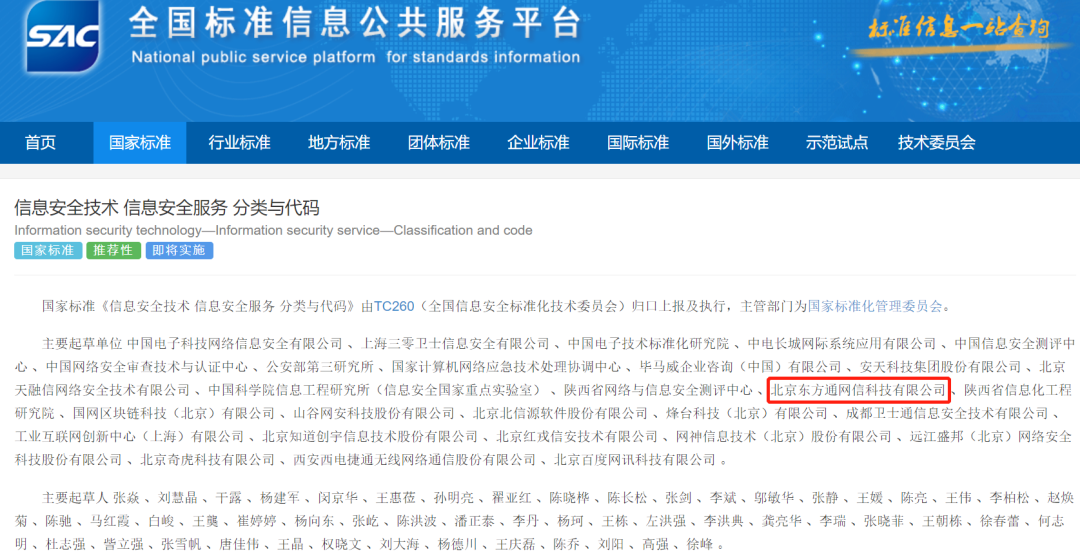 通过参与制定GB/T 30283-2022《信息安全技术 信息安全服务 分类与代码》,东方通对信息安全服务有了更深刻的体系化、标准化认识,对于信息安全服务开发、管理、交付等各个环节的业务场景也有了深刻的洞察,将持续以安全管理与安全运营为核心,将标准化纳入日常工作,为广大用户提供更具前瞻性的信息安全、数据安全、网络安全、内容安全、安全合规管理、态势感知、安全中台等十大产品解决方案,为企业提供全流程的安全服务,打造稳固安全保障体系,构建“内生安全”防御机制。