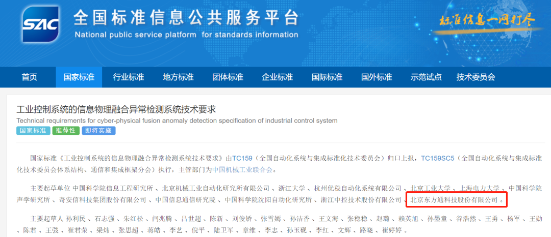 近日,东方通参与制定的两项国家标准:GB/T 30283-2022《信息安全技术 信息安全服务 分类与代码》和GB/T 41262-2022《工业控制系统的信息物理融合异常检测系统技术要求》正式发布。