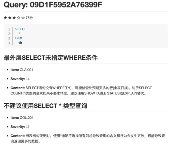 安装完成之后无需进行任何配置,只需要执行下面这条命令,就可以立刻生成一份Markdown格式的SQL评审报告,根据报告中的建议对SQL进行修改。