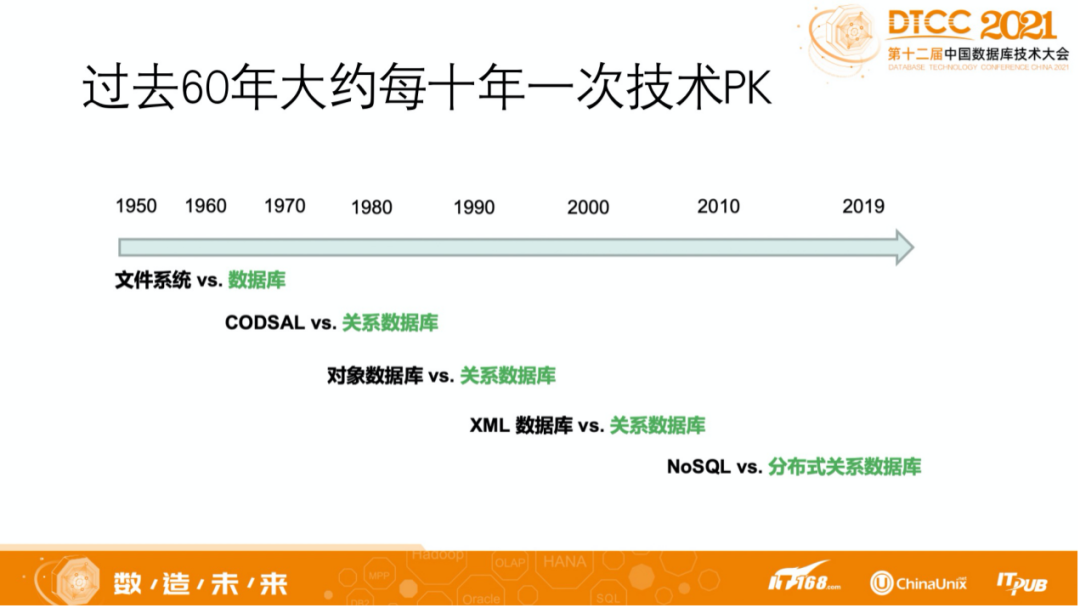 纵观过去60年,我们不难发现,大约每隔10年,就会出现一次技术 PK。第一次是文件系统和数据库,第二次是 CODSAL 和关系数据库,第三次是 XML 数据库和关系数据库,第四次是 NoSQL 和分布式关系数据库。