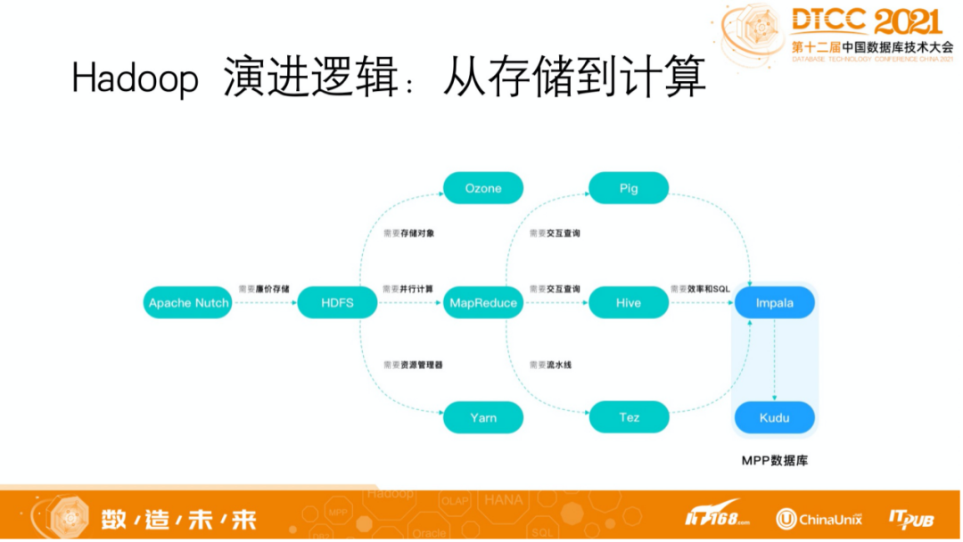 Apache Nutch 需要一个存储引擎,所以做了 HDFS,然后出现并行计算 MapReduce 和交互查询 Hive,继而又出现了效率较高的 Impala。到目前为止,Hadoop 有点远离大数据 C 位,这和它的底层演进逻辑有一定的关系。