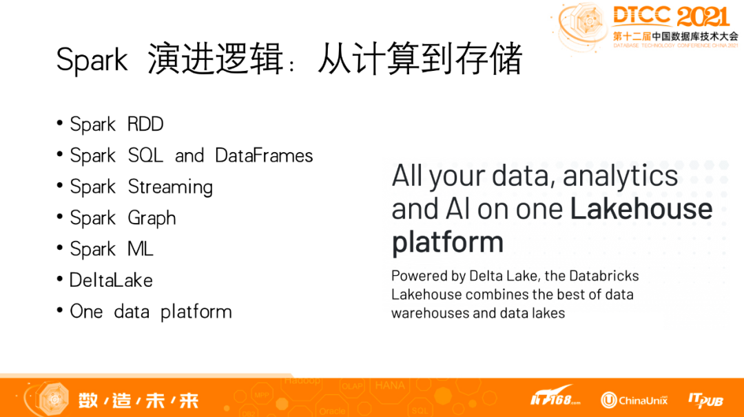 所以我们能够看出,Spark 前几年都在做计算,为了适应不同的场景,后来 Spark 面临数据存储和性能优化的问题,开始做 DeltaLake。同时提出了一个词,叫做 Lakehouse,它是一种结合了数据湖和数据仓库优势的新范式。
