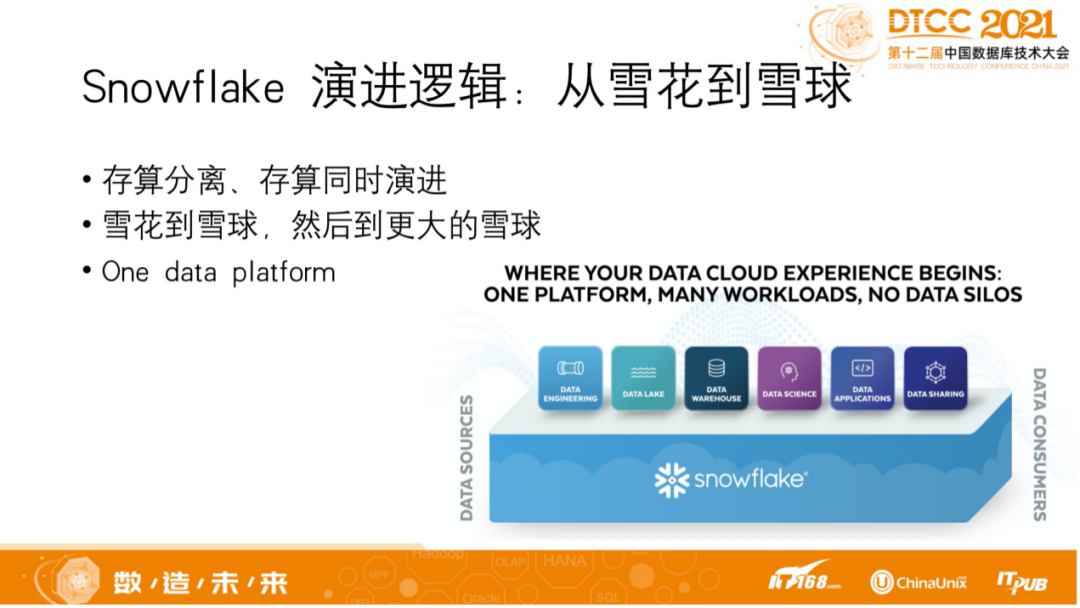 第三个 Snowflake 的演进逻辑为从雪花到雪球,然后到更大的雪球。它背后的关键设计是存算分离、存算同时演进,开始就是一个完整的数据库,存储层和计算层都不断变化更新。