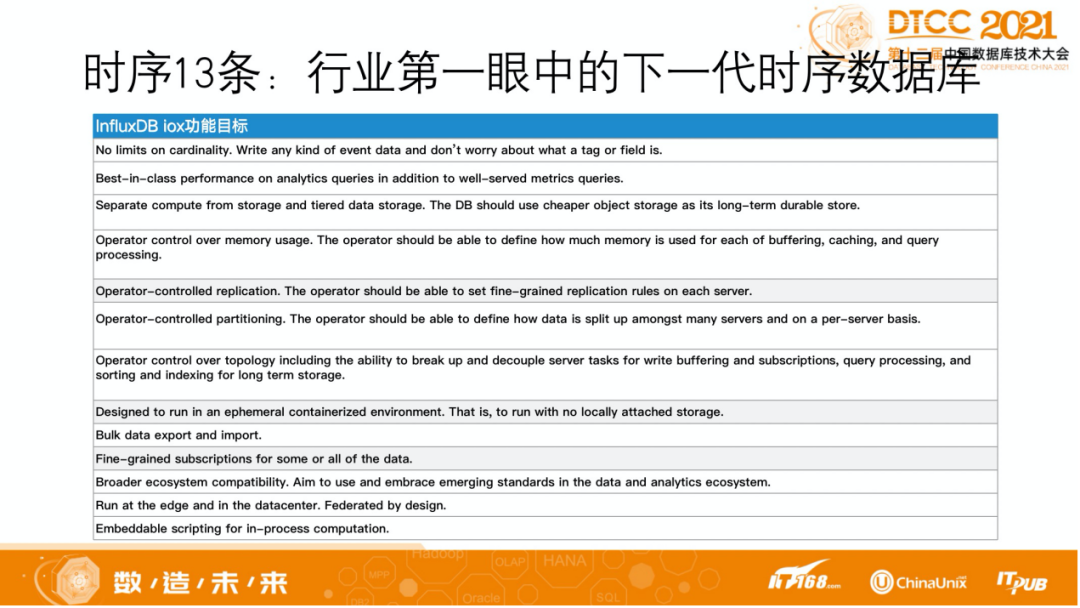 上图为行业流行度排名第一的时序数据库 InfluxDB 的下一代时序数据库 IOx 要实现的目标,我们可以关注两点。一个是扩展性,第二个是分析性能。这也表明了流行度行业老大 InfluxDB 在时序领域摸爬滚打了多年后对未来时序场景的认知和判断。