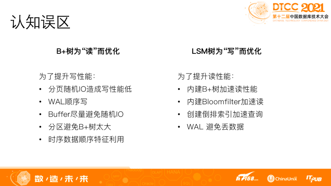 值得一提的是,理论上讲 B+ 树为读而优化,LSM 树为写而优化。原因是B+ 树随机 IO 比较高,但是实际工程实现的时候,有很多手段来降低随机 IO,最大限度地平衡存储和计算,为了提升写的性能,譬如采用 WAL、通过 Buffer 尽量避免随机 IO,通过分区避免 B+ 树太大等,而 LSM 引擎为了提升读的性能,需要内建 B+ 树加速读性能,内建 Bloomfilter 加速读,创建倒排索引加速查询,使用 WAL 避免丢数据。所以最终效果如何还要看实际工程优化的情况。