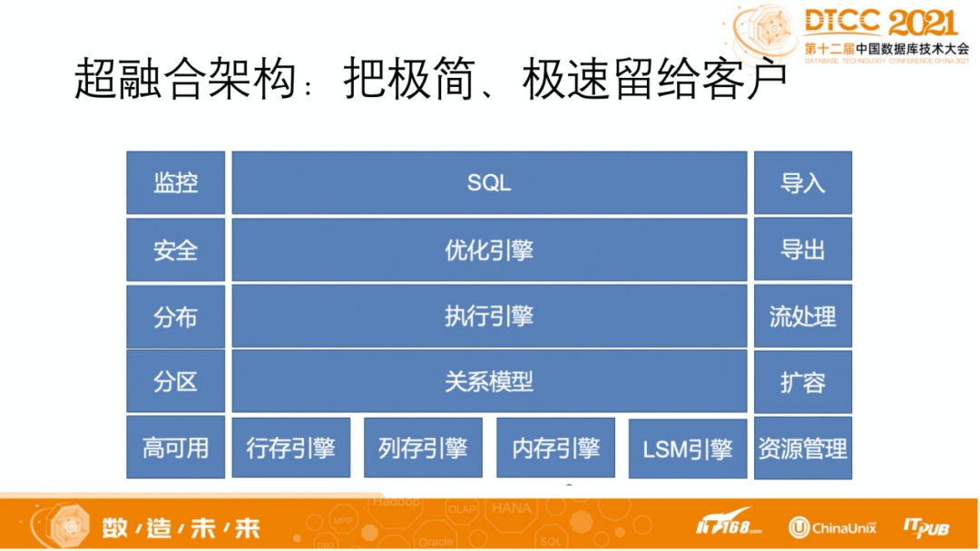 我们认为最好的时序架构是超融合架构,这种架构把极简、极速留给客户。超融合架构的核心是在数据库中,通过极致的可插拔,实现不同的存储引擎,可以是行存引擎、列存引擎、内存引擎、LSM 引擎等。它们之间是互相隔离,互相不会影响。