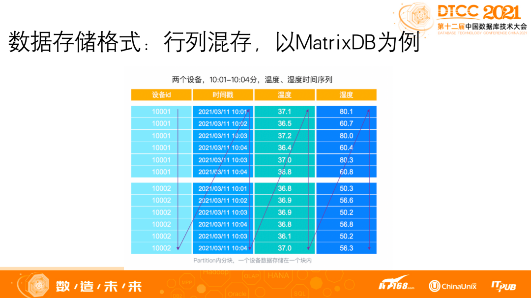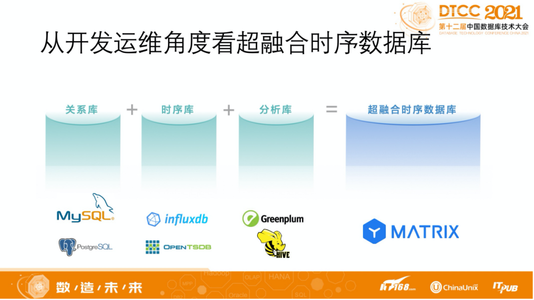 从开发运维角度来看,它就相当于是关系库+时序库+分析库。以 MatrixDB 为例,不同的表可以使用不同的存储引擎,譬如总共200张表,180张表使用 heap 存储,用以处理关系数据的读写,20张表为时序表,用以存储时序数据的读写,他们之间还可以直接 JOIN。