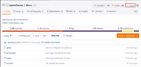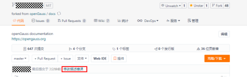 (1) 进入docs(文档)或者openGauss-server(代码)仓库。此处以docs仓库举例。如图1所示。