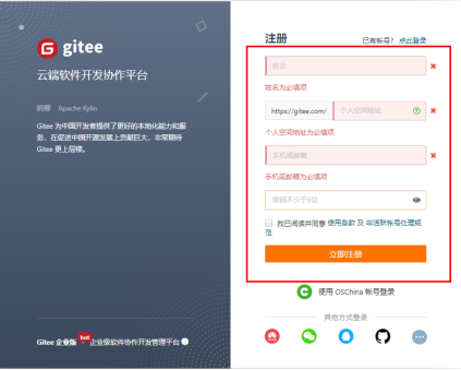 搭建开发环境之前需要在码云(https://gitee.com/)上完成注册Gitee账号、签署CLA协议(贡献者许可协议),详情请参见2.4.2社区环境准备。