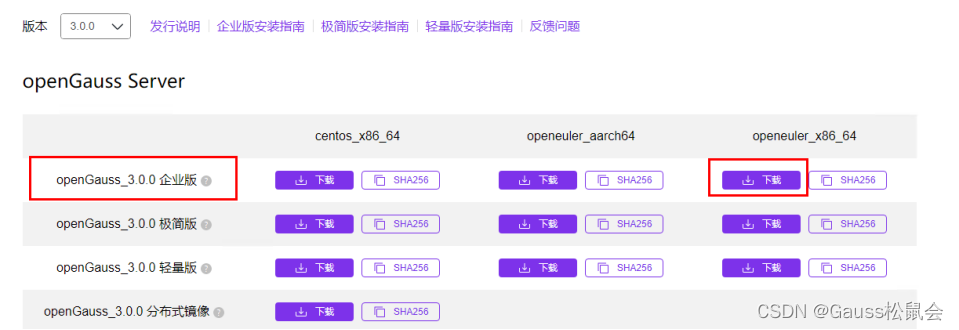 1. 通过https://opengauss.org/zh/download.html登录openGauss开源社区,选择3.0.0版本对应平台企业版安装包。