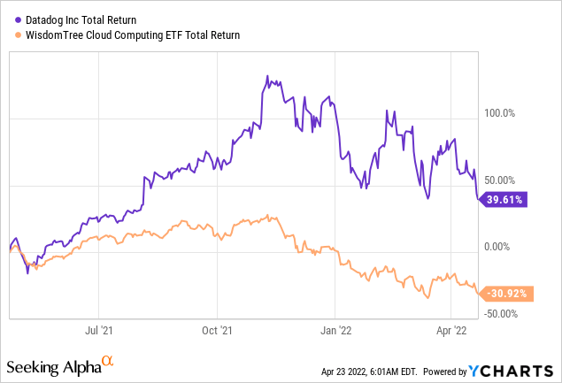 您可以看到 Datadog 与方舟基金 ETF 之一 WisdomTree 云计算 ETF ( WCLD ) 的相对表现,Datadog 本身就是该 ETF 的核心位置。