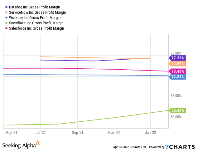 这种相对的超额表现在很大程度上可以归因于 Datadog 的出色增长以及强劲的毛利率和自由现金流的产生。虽然许多也是上述方舟 ETF 的一部分的公司具有同样强劲的毛利率,例如 Workday ( WDAY )、ServiceNow ( NOW )、Snowflake ( SNOW ) 或 Salesforce ( CRM ),但很明显 Datadog 的头寸本身在顶级类别。