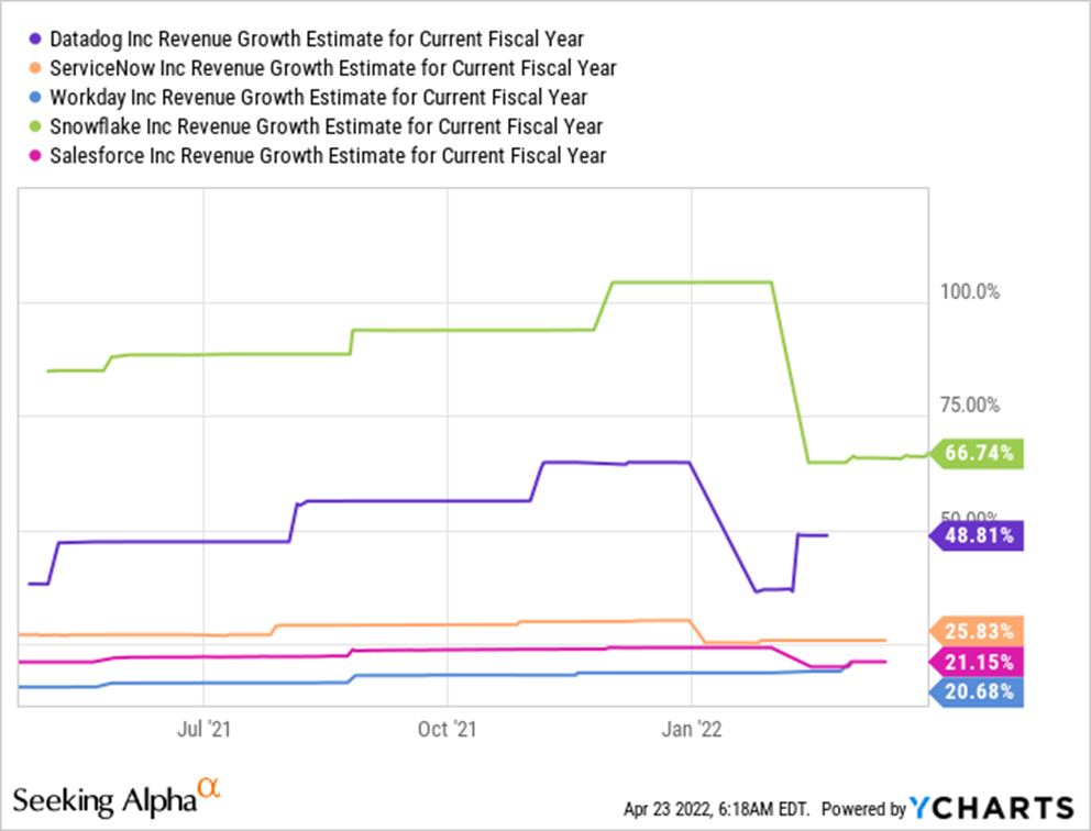 如果您查看 Datadog 在该同行组中的相对股票表现,很明显与其他公司相比,该股票的抛售压力相对较小。虽然 Datadog 强劲的业务基本面和增长前景可能在很大程度上解释了这种相对优异的表现,但我们认为,在当前市场环境下,随着美联储热衷于在未来实施多次加息,以及对经济衰退的担忧,股价可能还有进一步的修正空间。