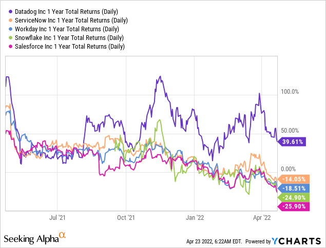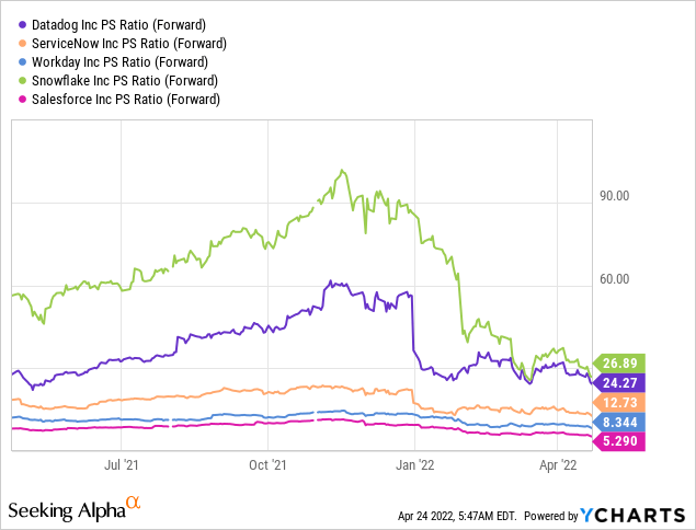 从远期 PS 比率来看,当前的估值差距非常明显。显然,Datadog 是一家杰出的公司,它正在定义自己的行业。然而,投资者对 Datadog 等高估值股票失去了兴趣,我们认为倍数可能还有进一步向下调整的空间。