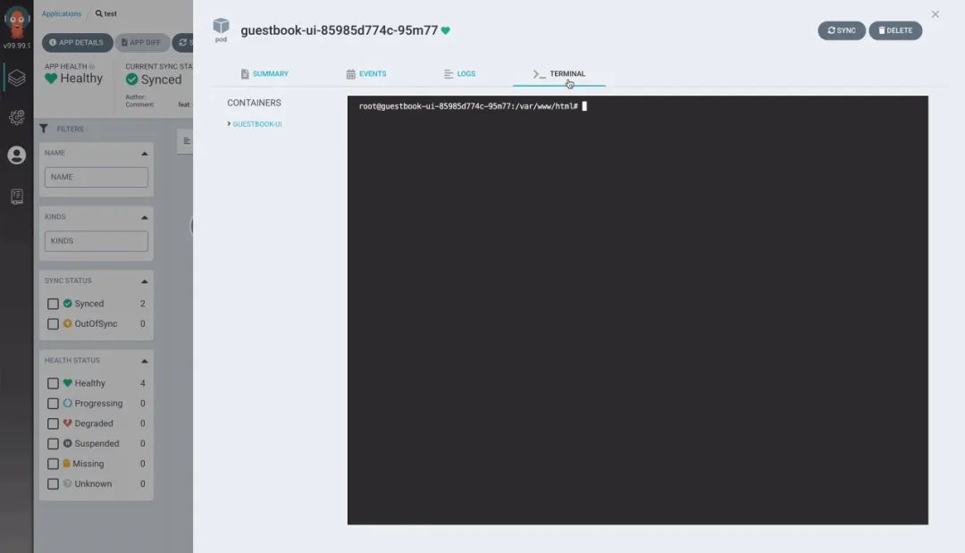 Argo CD 提供了一个 web 用户界面,作为一个超级强大的 Kubernetes 仪表板,帮助开发人员更好地了解他们的应用程序。用户界面可视化了所有的应用程序细节,比如 Kubernetes 资源层次结构、资源清单和实时日志呈现。v2.4 向前迈进了一步,使工程师能够在运行的应用程序容器中启动 shell,而无需离开 web 界面。只需使用应用程序详细信息页面找到所需的 Kubernetes Pod,单击它并选择 Terminal 选项卡。shell 会自动启动,使你能够执行所需的命令,并帮助解决应用程序状态问题。