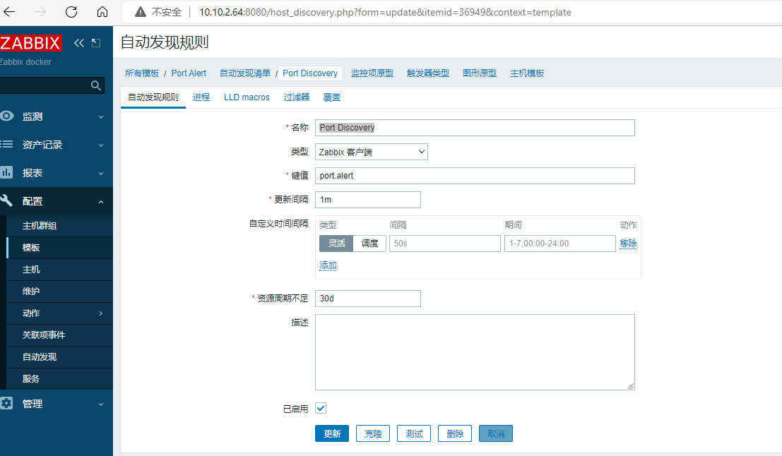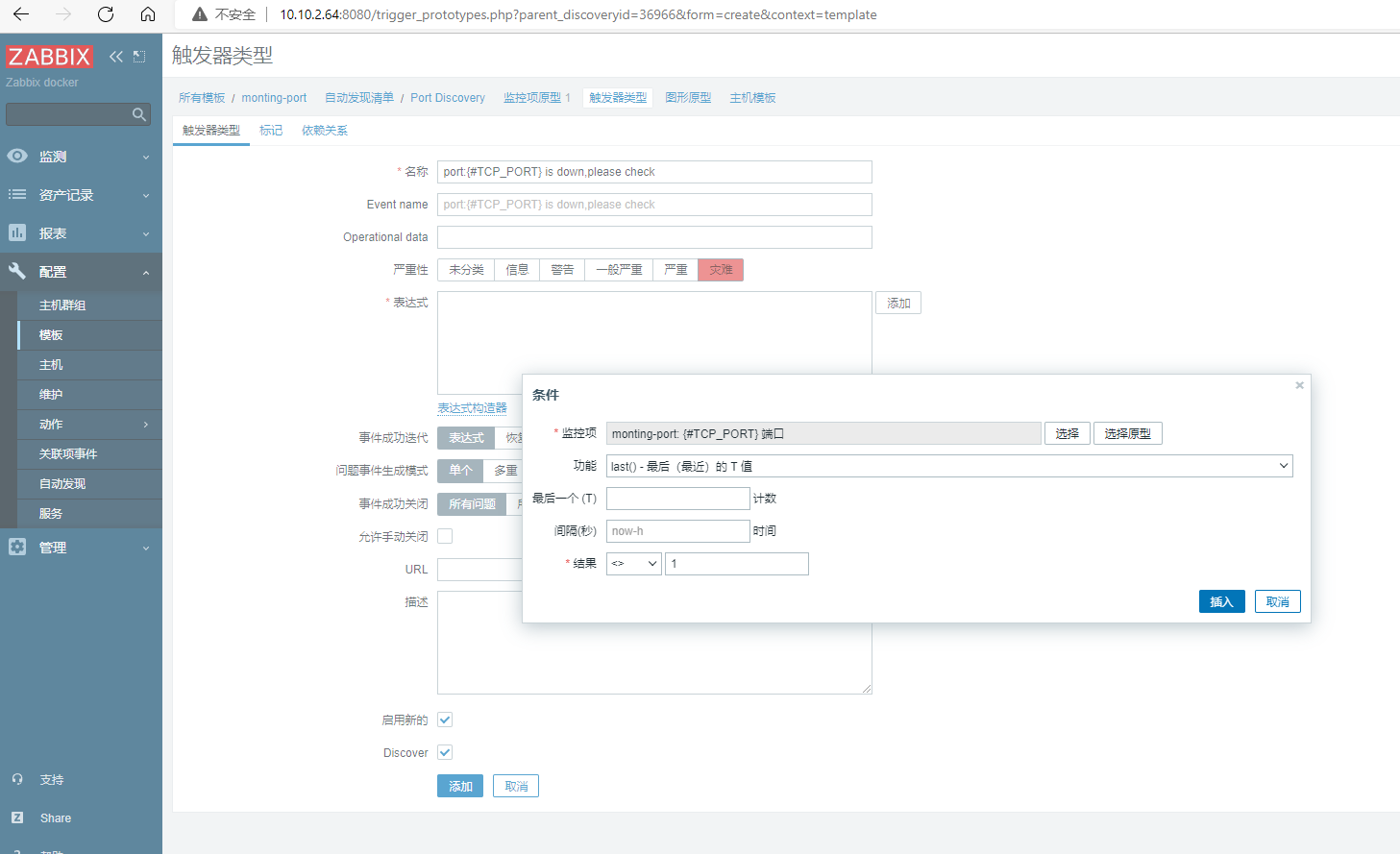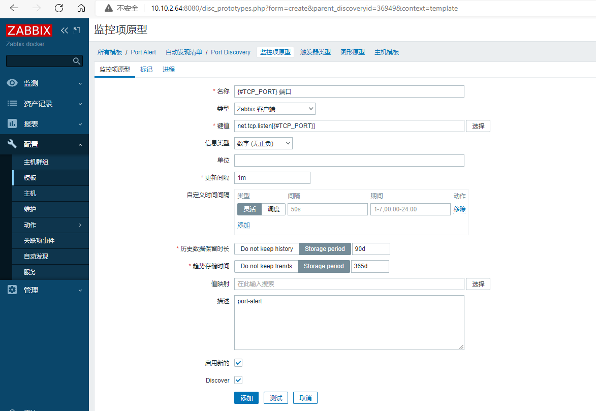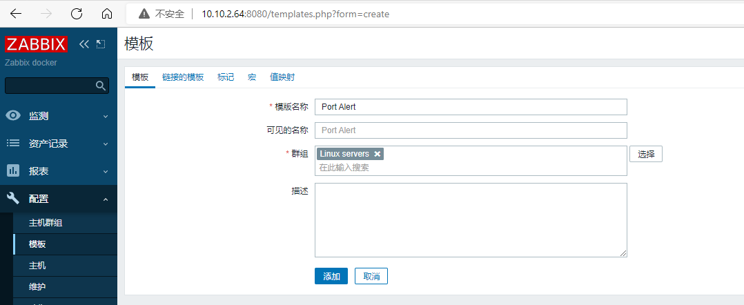 ### A 创建新的模板:Port Alert 可见名称哪里要写端口监控,或者monitor-port ,由于docker启动的zabbix-server环境,数据库和中文字体没有优化导致模板添加失败,谨记;