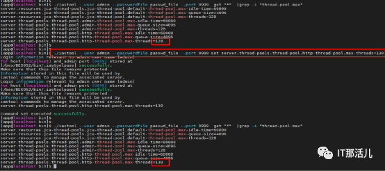 ./iastool --user admin --passwordfile passwd_file --port 9999 set server.thread-pools.thread-pool.http-thread-pool.max-threads=130
