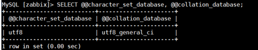 MySQL [zabbix]> SELECT @@character_set_database, @@collation_database;