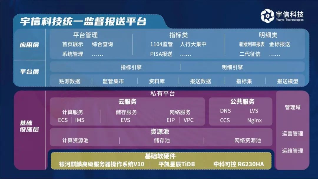 金融安全事关国家安全!2022年开年以来,在国家政策的大力支持下,信息技术应用创新开始在金融行业加速推进。多家机构也一致认为,经过2020-2021年的两年试点,金融信创有望进入全面推广阶段,行业保持高景气发展。作为国内金融IT的龙头企业,宇信科技是银行信创的全场景参与者,且经过3年的深耕,在市场覆盖、能力建设及生态合作等方面均取得了不错的成绩。目前,宇信科技参与的信创项目涵盖从OA企业管理、自助终端场景到营销管理、风控合规、数据中台、信贷中台等一般业务场景,再到支付清算、核心下移等关键场景。不仅如此,宇信科技还不断加强与产业链上下游伙伴的合作,已经形成从硬件到平台再到上层应用的全栈金融IT国产替代解决方案。近日,宇信科技在信创生态建设上再迎新进展。公司携手麒麟软件、平凯星辰、中科可控三家产业合作伙伴,联合推出了全国产化、采用分布式架构的统一监管报送联合解决方案,实现了金融信创在监管报送业务场景的落地应用。在该方案中,宇信科技的统一监管报送平台、银河麒麟高级服务器操作系统V10、平凯星辰的TiDB数据库、中科可控的R6230HA服务器将进行深度融合,为金融机构提供安全可控、稳定高效的,从基础软硬件到上层应用完整的解决方案,满足银行业监管报送范围大、上报接口众多、数据上报频率快、数据准确性高等特点。目前,该联合解决方案已在某政策银行部分上线运行,后续有望推广至更多的金融机构。据了解,此次联合解决方案的成功推出与落地,是四方强强联合、优势互补的结果。具体来讲,宇信科技、麒麟软件、平凯星辰、中科可控分别是金融IT领域、国产操作系统领域、开源数据库领域、国产服务器领域的龙头企业。在该方案中,宇信科技在监管报送领域的产品及行业经验优势,叠加银河麒麟高级服务器操作系统V10的高安全性、高可用性、高灵活性、高可维护性,TiDB水平弹性扩展、数据强一致、HTAP特性以及R6230HA服务器卓越的计算和扩展能力,实现了1+1+1+1>4的效果,在行业内具有无可比拟的竞争优势。