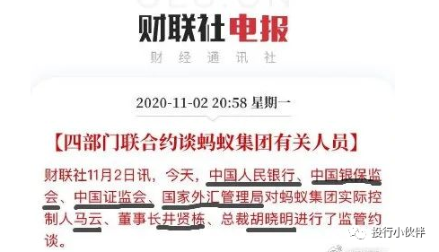中国人民银行、中国银保监会、中国证监会、国家外汇管理局对蚂蚁集团实际控制人马云、董事长井贤栋、总裁胡晓明进行了监管约谈。