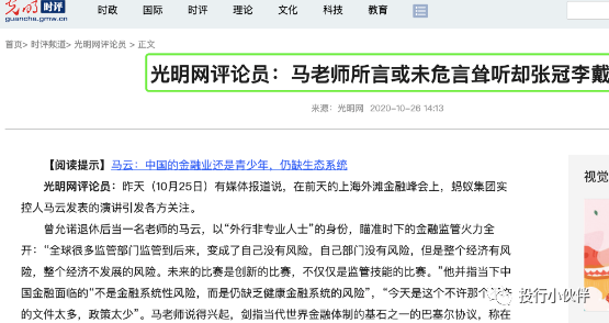由中共中央主办的光明日报旗下的光明网10月26日发表了题为《马云所言或未危言耸听却张冠李戴》的评论员文章,称马云问题不是张冠李戴那么简单。