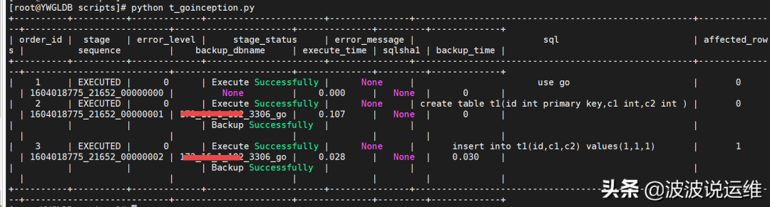import pymysqlimport prettytable as pttb = pt.PrettyTable()sql = '''/*--user=root;--password=password;--host=127.0.0.1;--check=0;--port=3306;--execute=1;--backup=1;*/inception_magic_start;use go;create table t1(id int primary key,c1 int,c2 int );insert into t1(id,c1,c2) values(1,1,1);inception_magic_commit;'''conn = pymysql.connect(host='127.0.0.1', user='', passwd='', db='', port=8888, charset="utf8mb4")cur = conn.cursor()ret = cur.execute(sql)result = cur.fetchall()cur.close()conn.close()tb.field_names = [i[0] for i in cur.description]for row in result: tb.add_row(row)print(tb)