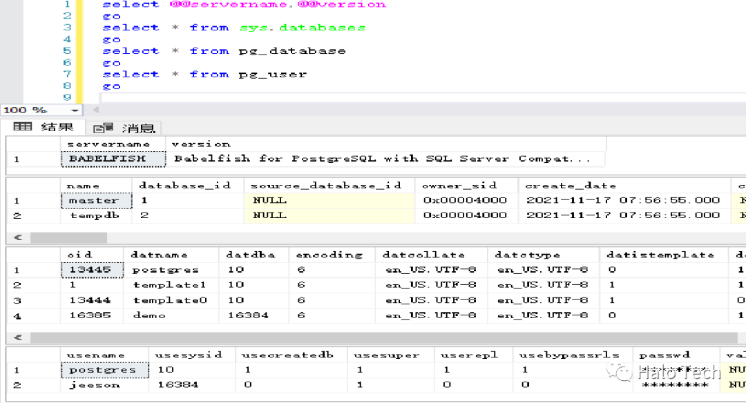 #进入Babelfish extension 源码安装目录cd $EXTENSIONS_SOURCE_CODE_PATH# Install babelfishpg_money extensioncd contrib/babelfishpg_moneymakemake install# Install babelfishpg_common extensioncd ../babelfishpg_commonmakemake install# Install babelfishpg_tds extensioncd ../babelfishpg_tdsmakemake install# Installs the babelfishpg_tsql extensioncd ../babelfishpg_tsqlmakemake install
