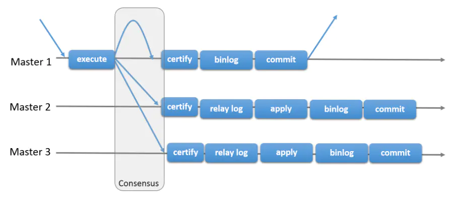 MySQL 5.7 推出了组复制(MySQL Group Replication,简称:MGR),是基于内置的主从复制的架构实现的,主要在事务提交的过程中,嵌入单独的 binlog 封装逻辑,并通过专门的复制通道进行数据传输,Group Replication 复制插件使用 Paxos 协议的原子广播特性,来保证在集群内的大多数节点都能接收到数据包,当数据节点接收到 write set 之后,每个节点上按照相同的规则对事务进行排序,并进行冲突检测。对于 master,当冲突检测通过之后,数据变更写入自身的 binlog 中,然后进行存储引擎层的提交(如果发现事务冲突,则进行事务回滚);对于 slave,当冲突检测通过之后,就把主库发来的 binlog 写入自身的 relay log 中,然后 sql 线程读取 relay log 进行重放,并把重放的 binlog 日志写入自身的 binlog 中,然后存储引擎内部进行提交(如果发现事务冲突,则丢弃主库发送过来的 binlog 日志) 。假设 3 个节点的集群,当写节点 crash 之后,集群内部重新选举一个节点作为新的写节点,整个写请求故障转移过程都是 Group Replication 内部自动完成(当然,写请求具体发送到哪个节点,还是需要更新 DNS 解析或者使用其它插件),解决了某个节点挂了如何踢掉或者恢复后如何加入集群(异步复制和半同步复制都需要人为干预或者依赖其他插件)。 4 并行复制