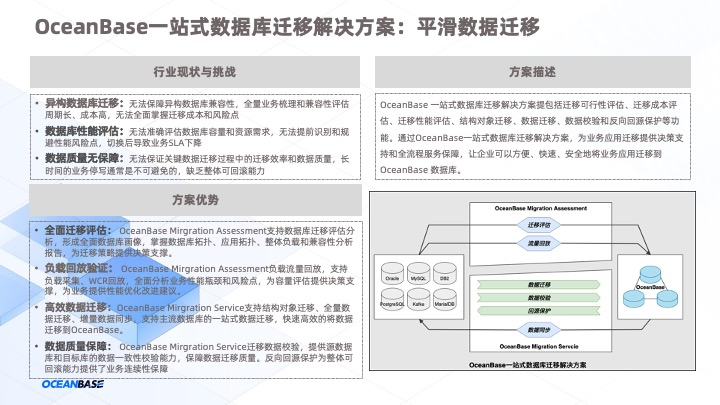 很多客户会担心,如果 OceanBase 出了问题怎么办呢?我们把你的应用指向 OceanBase 之后,会做一个链路回切的动作,再把 OceanBase 的数据写回原来的数据库,这样如果有问题,可以再把这个应用切回原来的数据库就好了。整个过程的停机窗口是短的,数据库本身是不需要停机。