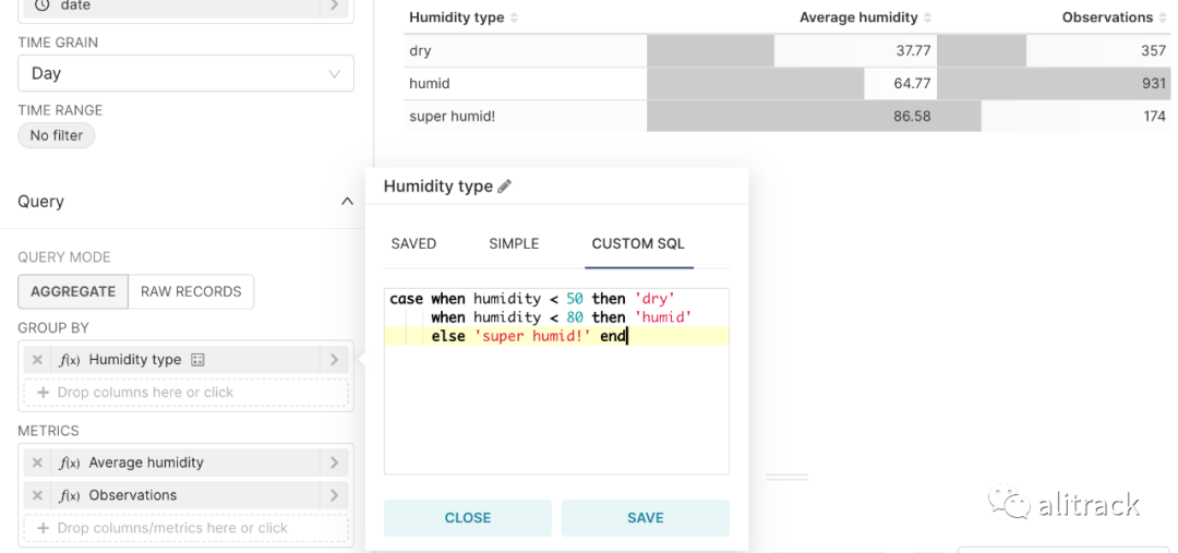 除了能够为临时指标和过滤器编写自定义 SQL 之外,列控件现在还具有自定义 SQL 选项卡。这使得可以直接在图表中编写自定义表达式,而无需将它们作为保存的表达式添加到数据集中。
