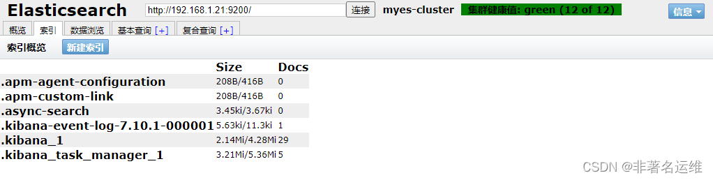 [root@es-master21 mnt]# cd logstash/[root@es-master21 logstash]# vim config/logstash.conf (使用时删除文件中带#的配置项,不然yml文件格式不对)input { redis { port => "6379" host => "192.168.1.21" password => "123456" data_type => "list" db => "0" key => "nginx_log" }}output { #根据redis键 messages_secure 对应的列表值中,每一行数据的其中一个参数来判断日志来源 if [log_source] == 'access' { #注意判断条件的写法 elasticsearch { hosts => ["192.168.1.21:9200","192.168.1.22:9200","192.168.1.23:9200"] index => "nginx-access-%{+YYYY.MM.dd}" #user => "elastic" #password => "elastic123" } } if [log_source] == 'error' { #注意判断条件的写法 elasticsearch { hosts => ["192.168.1.21:9200","192.168.1.22:9200","192.168.1.23:9200"] index => "nginx-error-%{+YYYY.MM.dd}"} [root@es-node22 mnt]# docker-compose -f docker-compose.yml up -d[root@es-master21 mnt]# docker-compose ps Name Command State Ports---------------------------------------------------------------------------------------------------------elasticsearch /tini -- /usr/local/bin/do ... Up 0.0.0.0:9200->9200/tcp,:::9200->9200/tcp, 0.0.0.0:9300->9300/tcp,:::9300->9300/tcpelasticsearch-head /bin/sh -c grunt server Up 0.0.0.0:9100->9100/tcp,:::9100->9100/tcpfilebeat /usr/local/bin/docker-entr ... Upkibana /usr/local/bin/dumb-init - ... Up 0.0.0.0:5601->5601/tcp,:::5601->5601/tcplogstash /usr/local/bin/docker-entr ... Up 0.0.0.0:5044->5044/tcp,:::5044->5044/tcp, 9600/tcpredis docker-entrypoint.sh redis ... Up 0.0.0.0:6379->6379/tcp,:::6379->6379/tcp