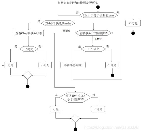 进一步结合前面讲过的行头的结构(其中的 xmin、xmax)、Clog以及上述 CSNLog的映射机制,MVCC的大致判断流程如图15所示。