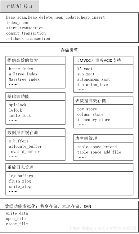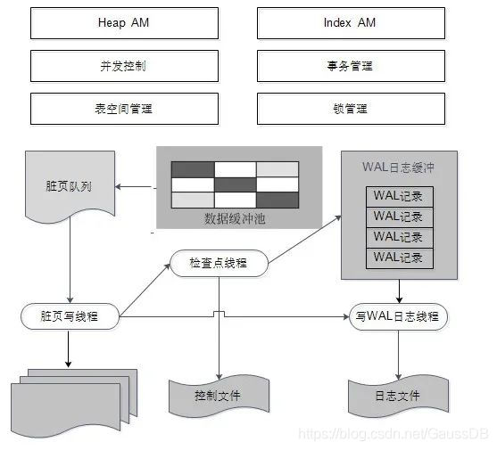 openGauss的行存储引擎在设计上支持 MVCC,采用集中式垃圾版本回收机制,可以提供 OLTP业务系统的高并发读写要求,支持存储、计算分离架构,存储层异步回放日志。行存储引擎架构如图1所示。