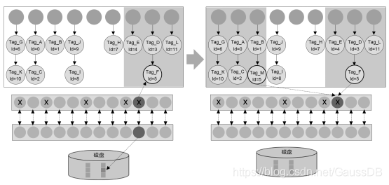 图注:数据页面缓存池中缓存数据页面,在数据页面中存放元组以及元组的历史版本并集中管理,使用 Vacuum(垃圾清理)线程进行定期的空间回收。