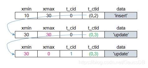 第二个版本也变为历史版本,通过ctid指向最新版本,不过值得注意的是,第二个版本的xmin、xmax都为30,即此版本在同一事务中被删除,而最新版本 xmin仍为30,只是t-cid从0增加为1[假设此事务连续执行了两次更新(update)操作]