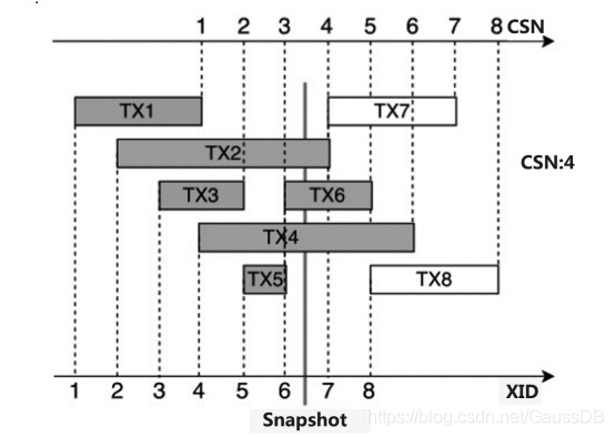 因此当一个事务拿到的快照为 CSN=3时,事务 TX2、TX4、TX6、TX7、TX8的CSN 分别为4、6、5、7、8,对于该事务的快照而言,这几个事务的修改都不可见。