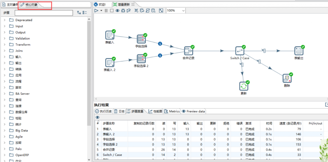 在核心对象中分别选择两个表输入,作为旧数据源和新数据源,分别配置数据库连接;
