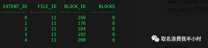 | select extent_id,file_id,block_id,blocks from dba_extents where segment_name='TB0805'; |