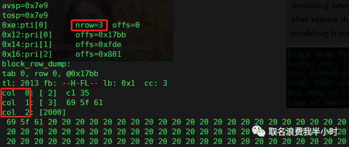 我随机挑了一个块(11号文件的188号块)从上图可以看出,该块为存储业务数据的块,并且这里有一点需要注意:数据块中是不会存储表的名字、表中列的名字以及列的类型的,列的名字用col 0,col 1,col 2等代替。