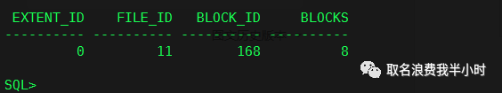 此时发现只剩下一个区段信息,这个区段虽然还是原来11号文件,168号块及后面的7个块,但是oracle现在已经认为这是一个新的段,这也就解释了为什么truncate之后data_object_id值会增加的原因了。