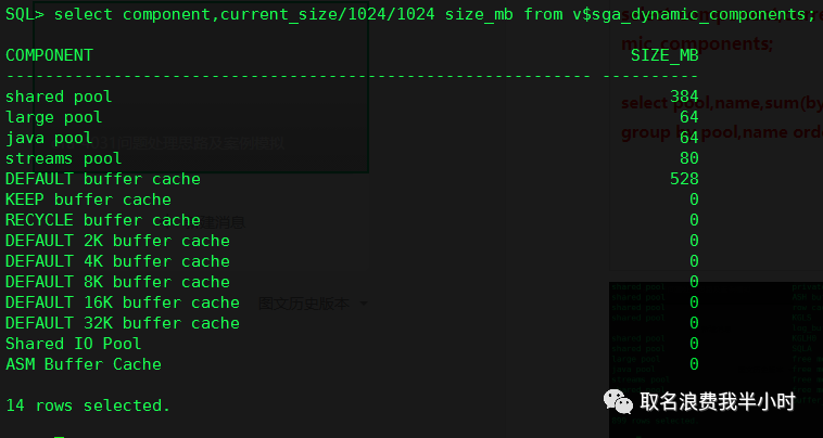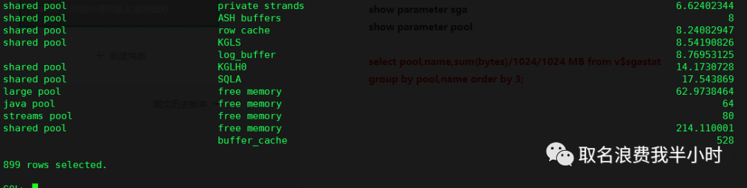 show parameter sga show parameter pool select component,current_size/1024/1024 size_mb from v$sga_dynamic_components; select pool,name,sum(bytes)/1024/1024 MB from v$sgastat group by pool,name order by 3; set lines 200 pages 200 select pool,name,sum(bytes)/1024/1024 MB from v$sgastat where pool = 'shared pool' group by pool,name having sum(bytes)/1024/1024>5 order by 3; |
