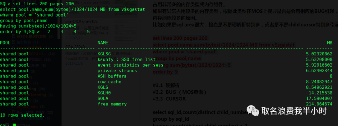 如果Shared Pool相较于系统规模来说足够大(一般几个G就已经很大了),检查Shared Pool中有没有占用非常多的内存类型或内存组件。如果有异常占用较多的内存类型,根据此类型在MOS上搜寻是否是会有相应的BUG引起,或者分析这种类型的内存消耗较多的原因。比如如果是sql area(SQLA)很大,检查是不是硬解析特别多,或者是不是child cursor特别多引起。